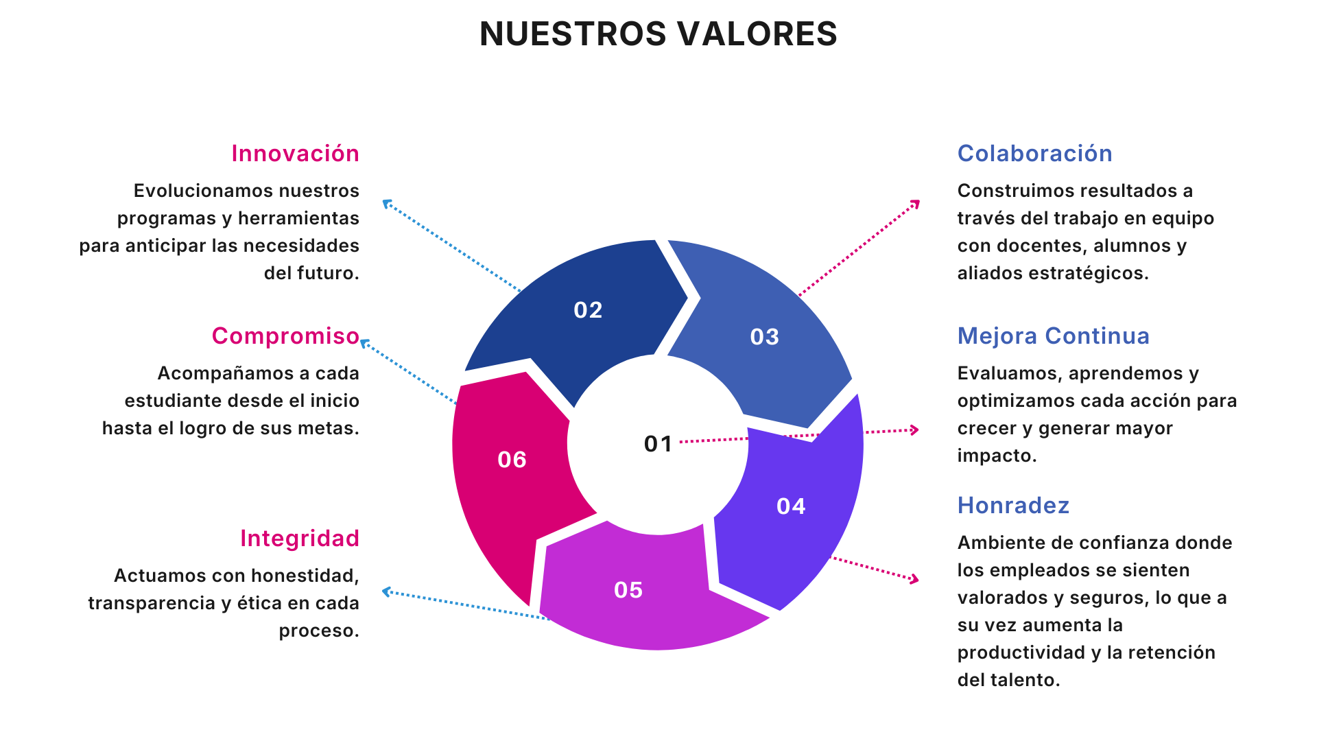 Impulsar el crecimiento profesional de nuestros estudiantes a través de programas de formación continua innovadores, accesibles y orientados a resultados. Transformamos metodologias en oportunidades, integrando tecnología, experiencia docente y un compromiso real con el progreso continuo humano y el desarrollo de nuestra sociedad.